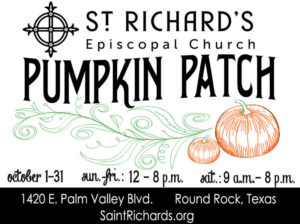 Saint Richard’s Pumpkin Patch is located at 1420 E. Palm Valley Blvd., Round Rock, TX 78664. The hours are Sunday–Friday 12 pm–dark and Saturday 9 am–dark. It’s a lot of fun!